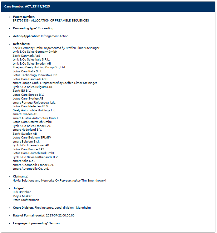 August 6, 2025——The UPC Mannheim LD updated case information, more details can be found that Nokia is suing Geely Group for patent infringement.